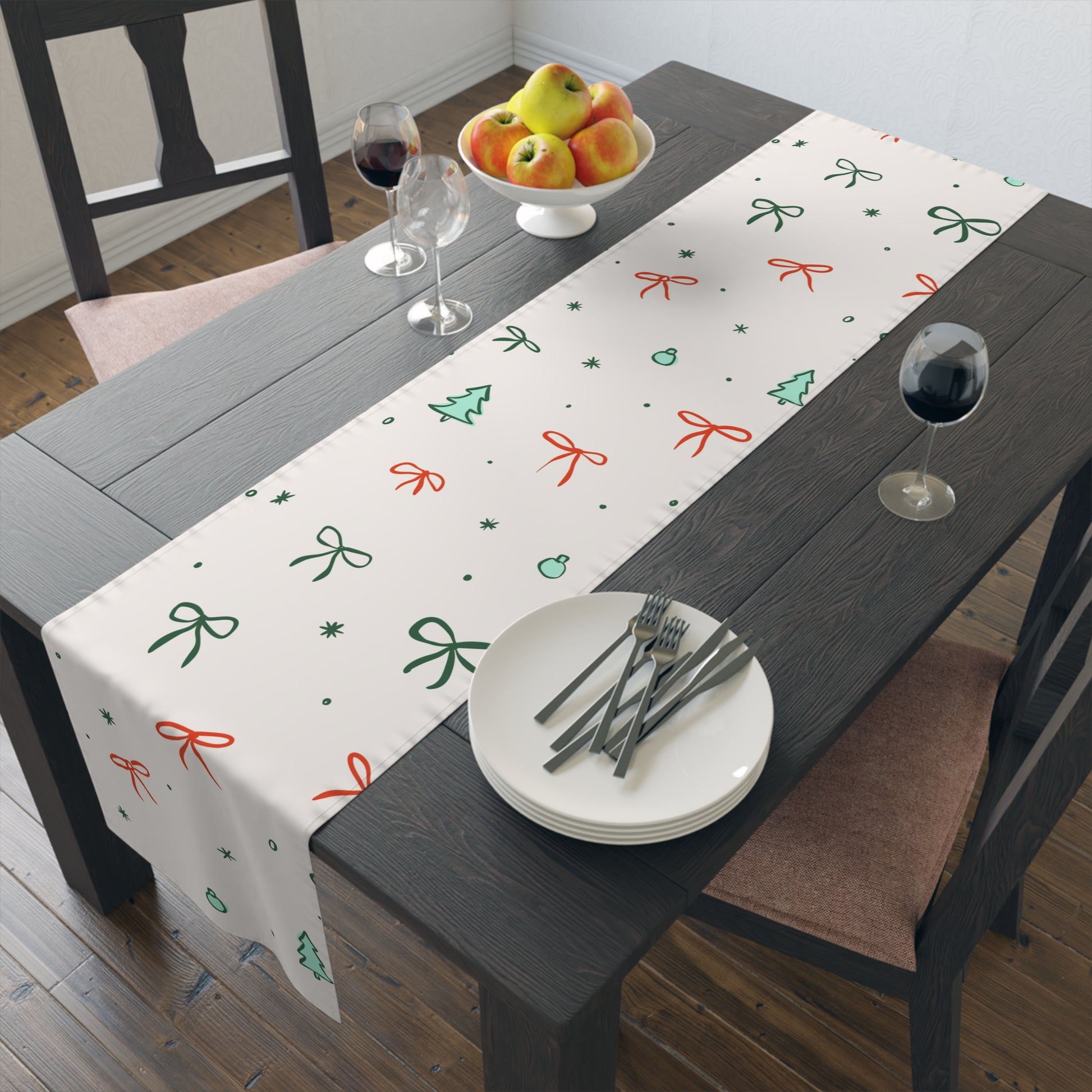 Complete your festive tablescape with our Christmas Ribbon Table Runner—designed to bring cozy seasonal charm to your kitchen or dining space. Available in your choice of cotton twill or polyester, each runner features vivid, one-sided printing that beautifully showcases a cheerful holiday village design. Perfect for family dinners, parties, or everyday décor throughout the season.