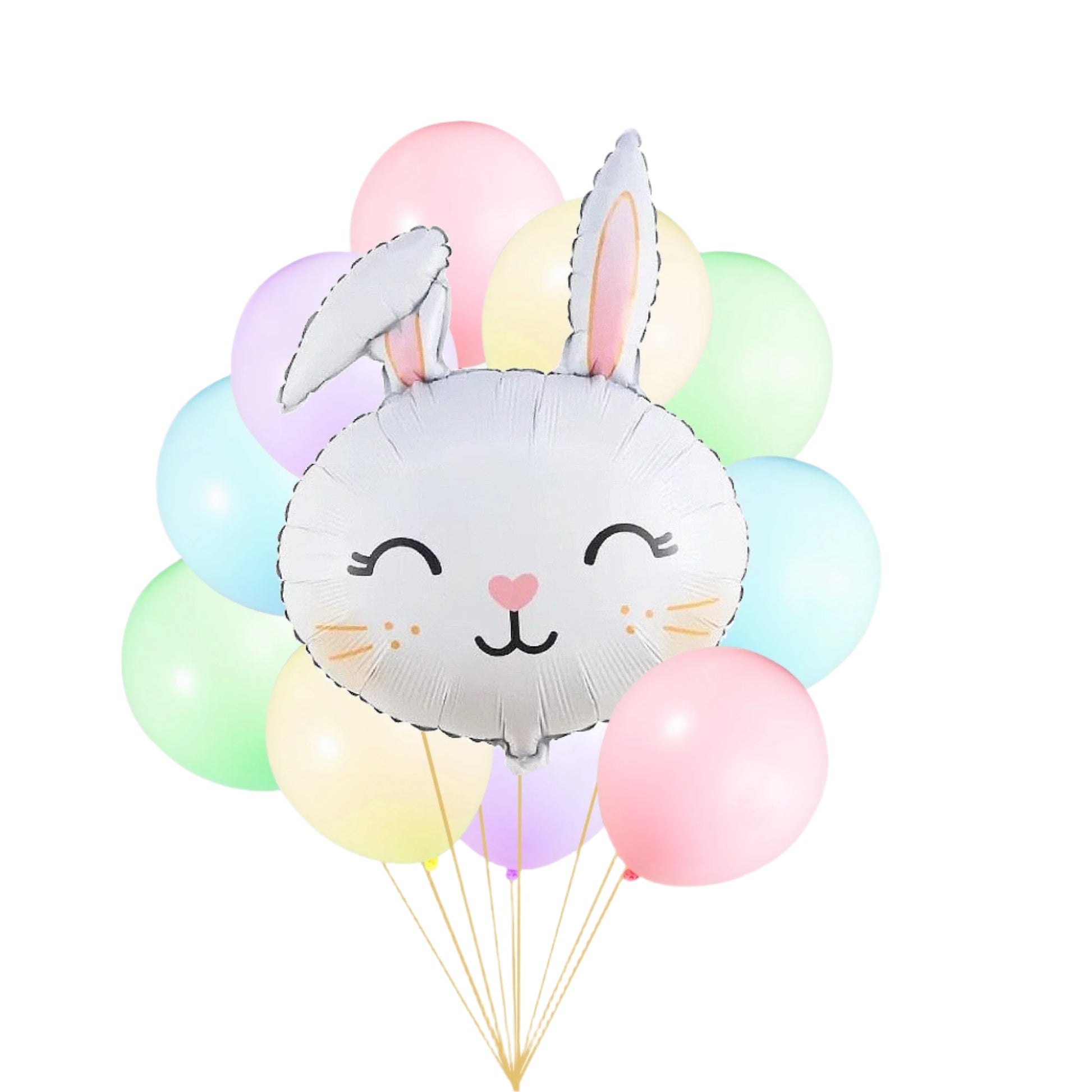 *WHAT'S INCLUDED:* Included in each balloon bouquet kit: - (10) 11-inch pastel balloons (2 of each) in pink, yellow, green, blue, and purple. - One (1) bunny head mylar balloon (22 inches)