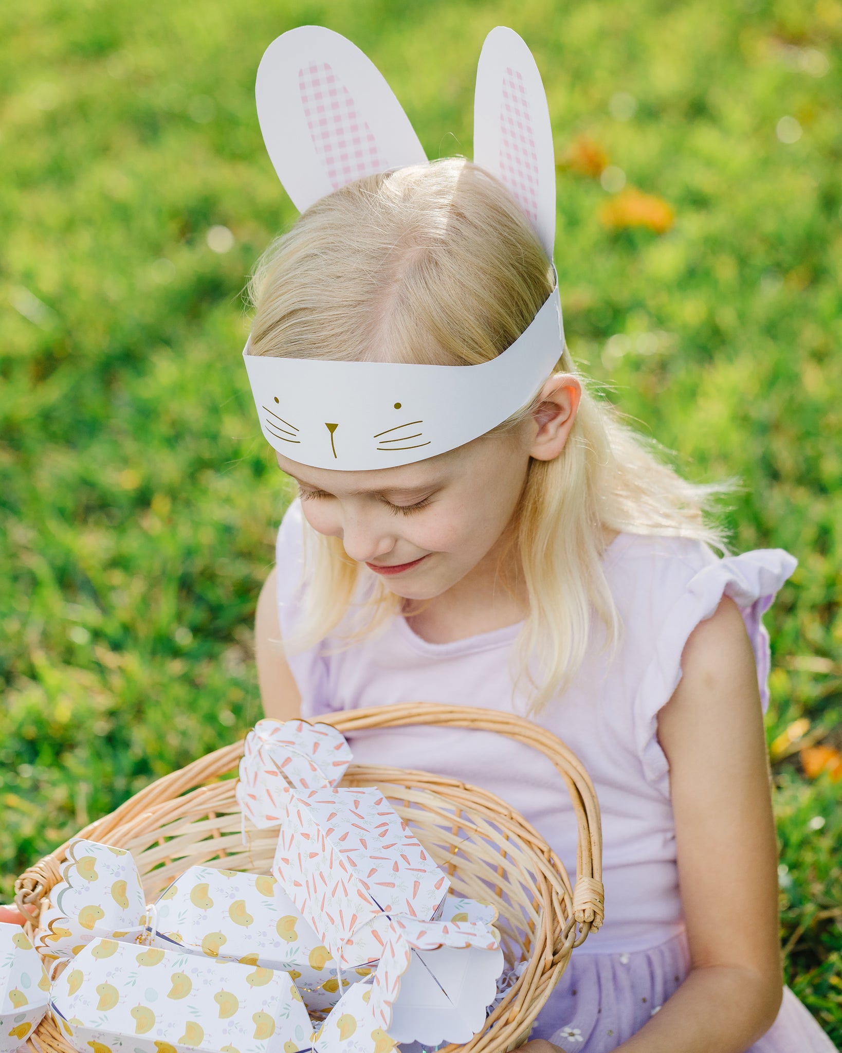 Hand out beautiful bunny accessories to your guest with these bunny crowns. Featuring cute gingham patterned ears and gold foil accents these bunny crowns are a whimsical alternative to party hats at your Easter egg hunt this year!