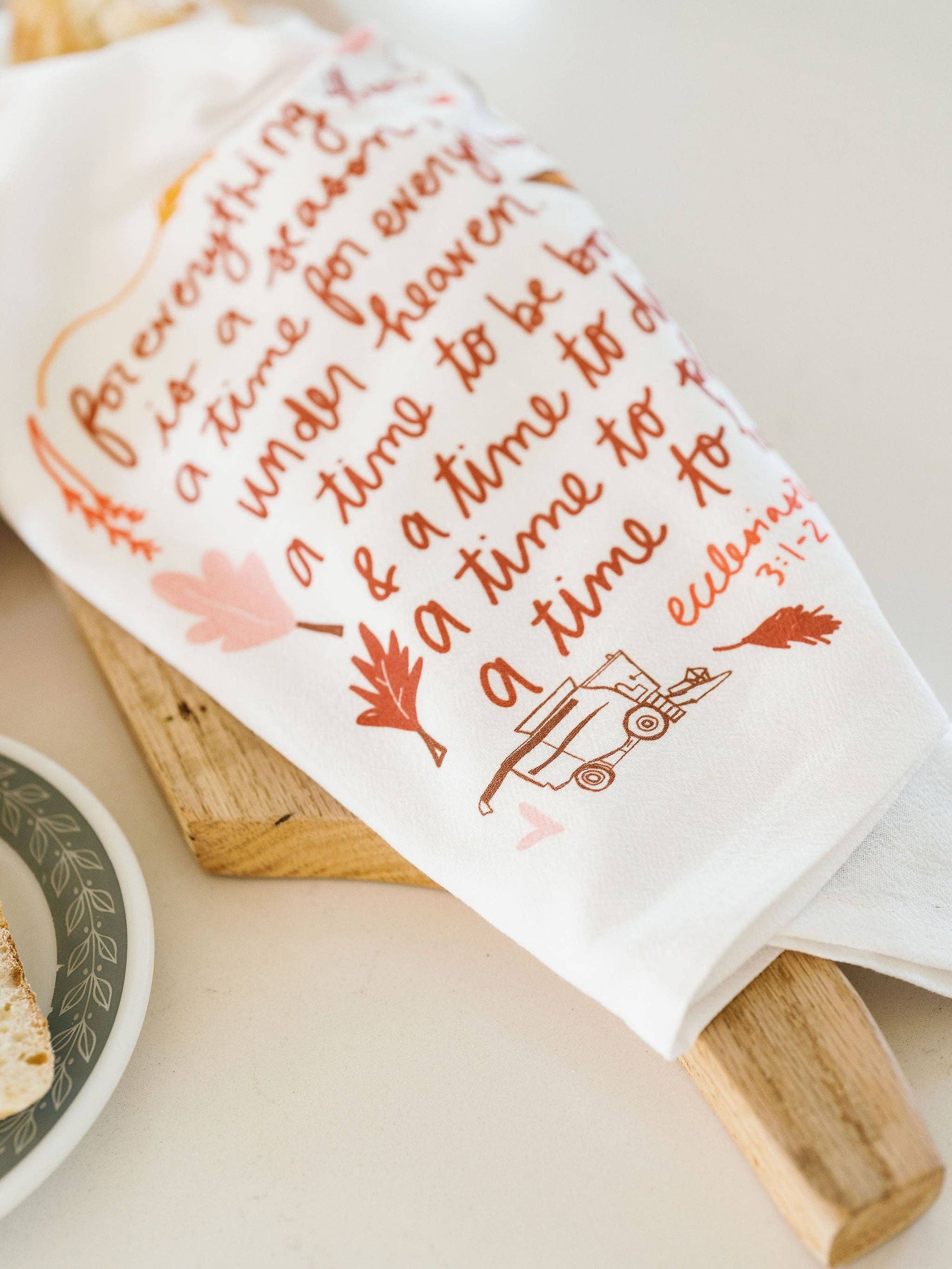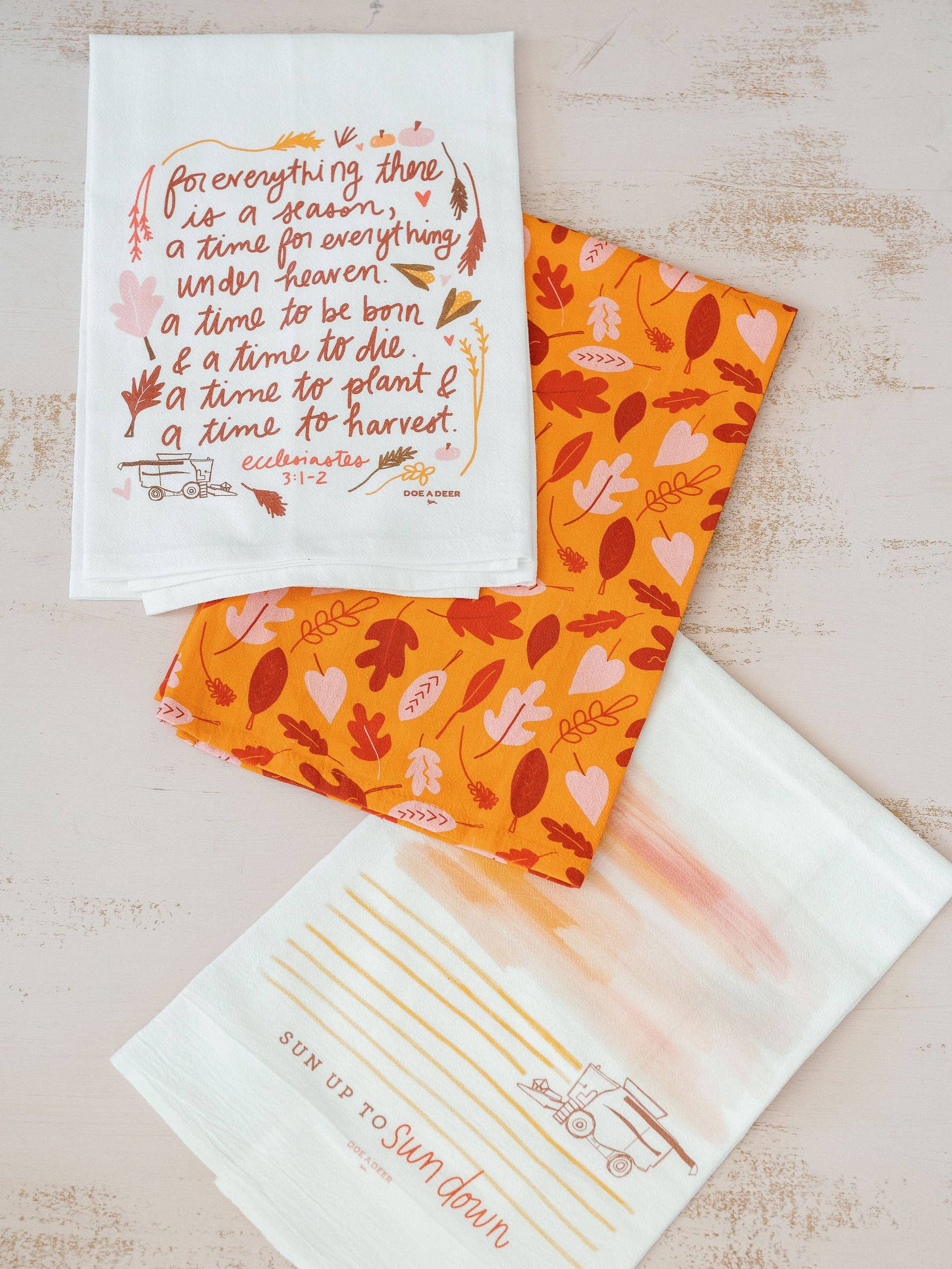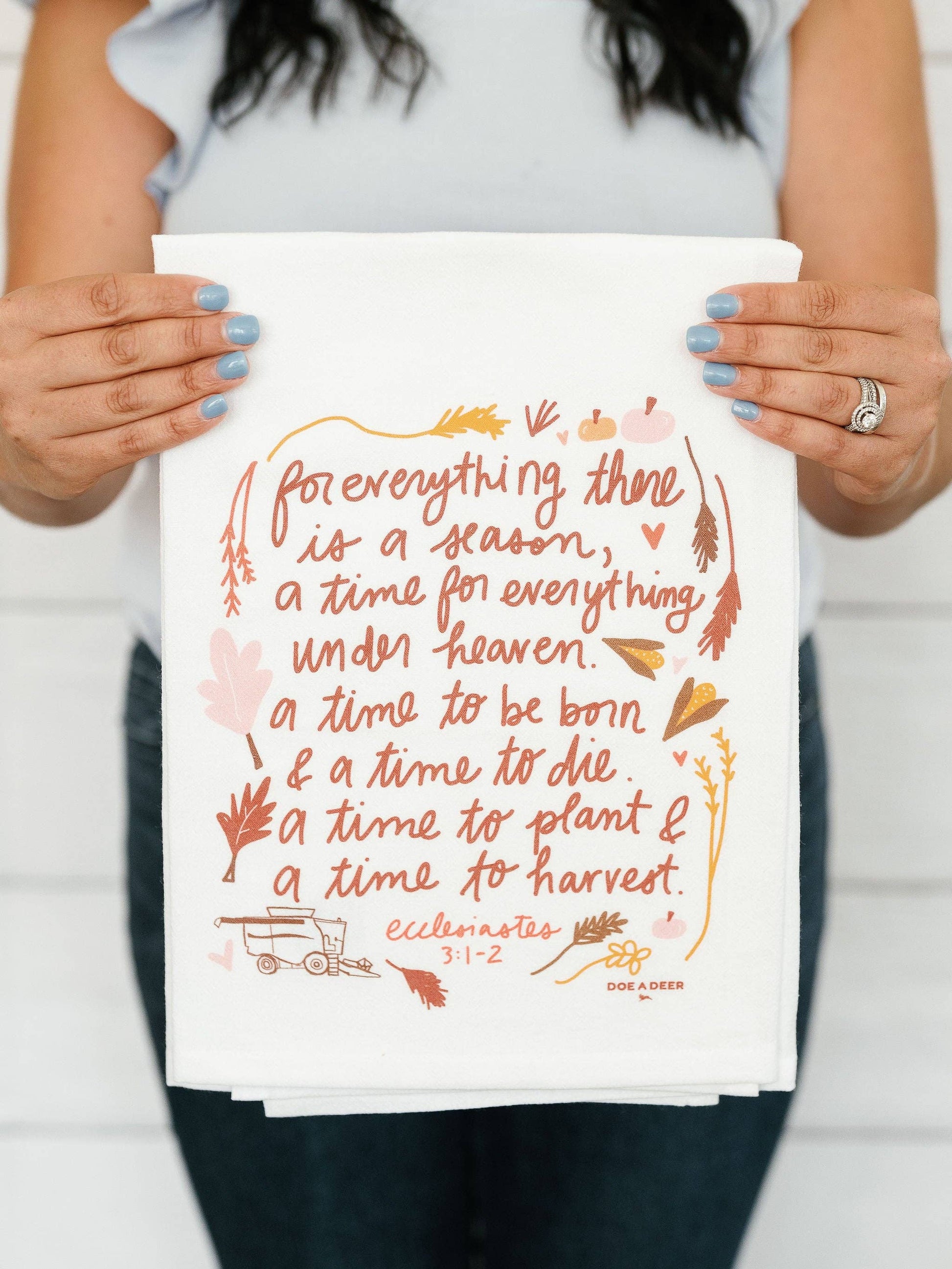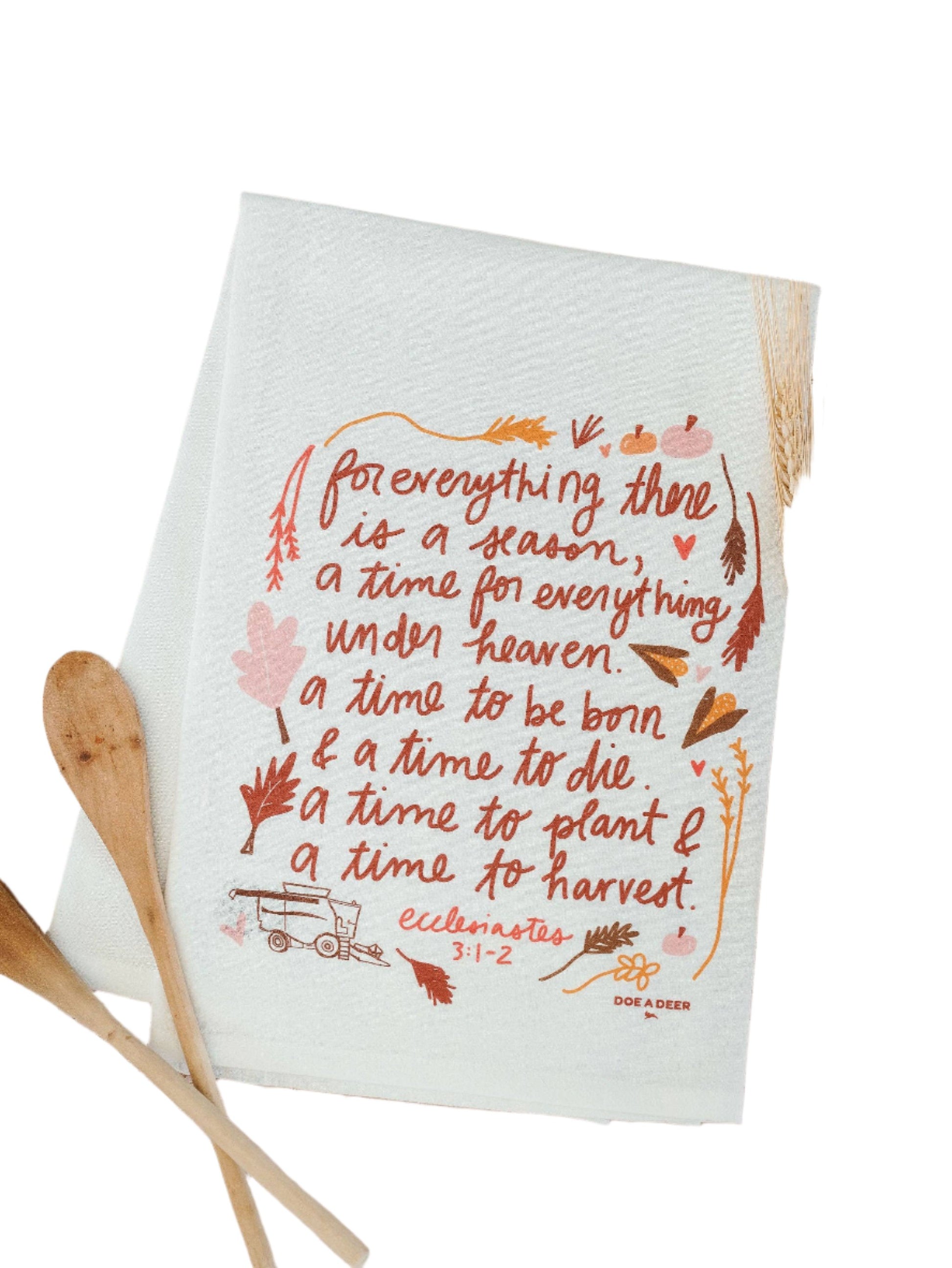 Something about this verse from Ecclesiastes brings a sense of calm and tranquility. For everything there is a season. With warm, earthy tones, this towel is perfect for Fall as our farmers get busy. Featuring hand illustrated leaves & combines for a dash of whimsy, we can’t wait to see these in your kitchen.
