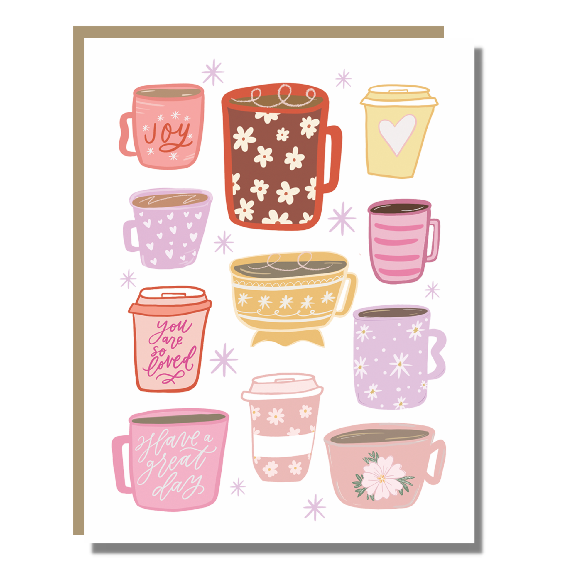 Is there anything more calming than a steaming cup of tea or coffee in a beautifully patterned mug? This delightful everyday note is perfect for your favorite coffee or tea lover! Cozy, sweet, and lovely! Hand-drawn illustrated coffee mugs on a white background.