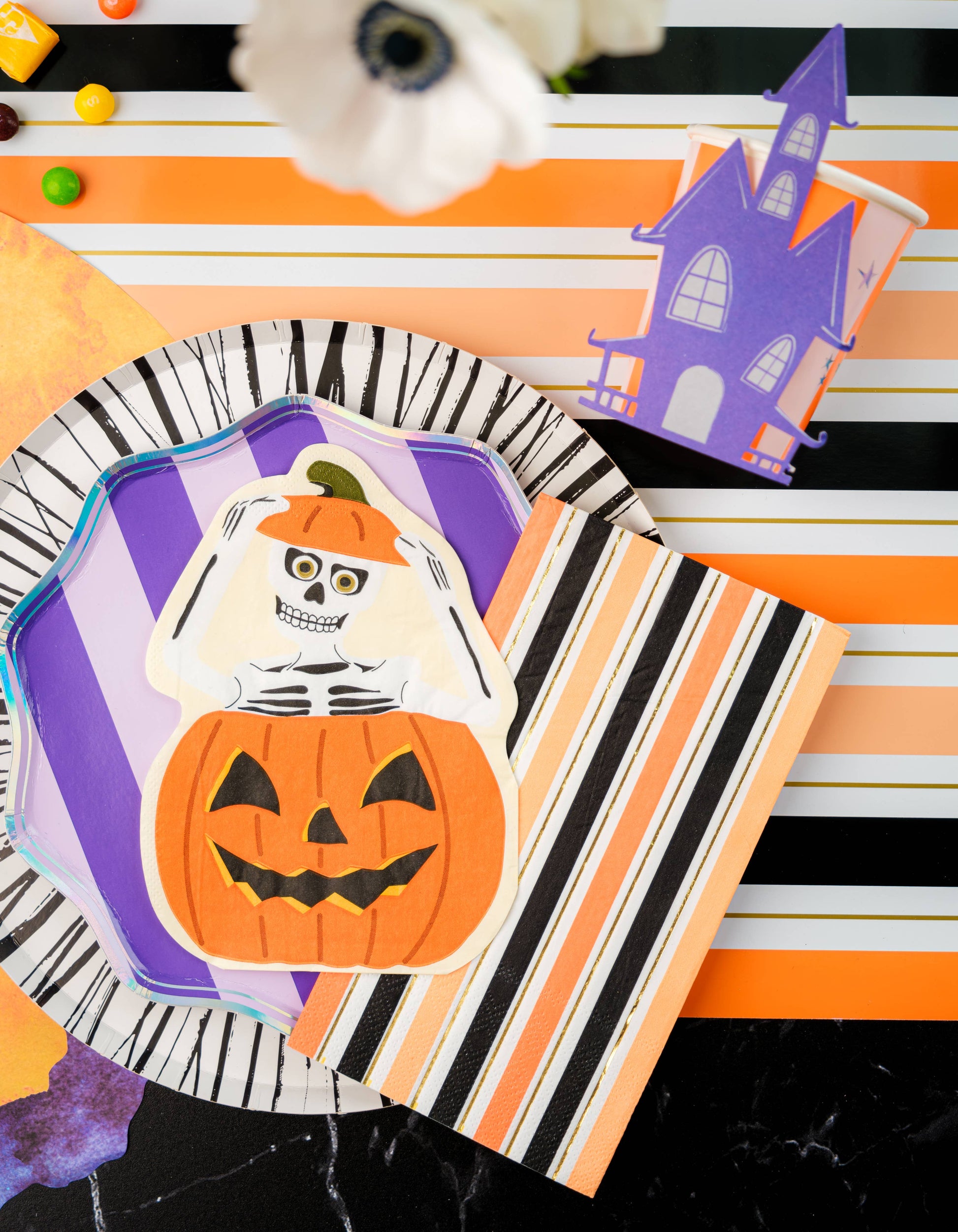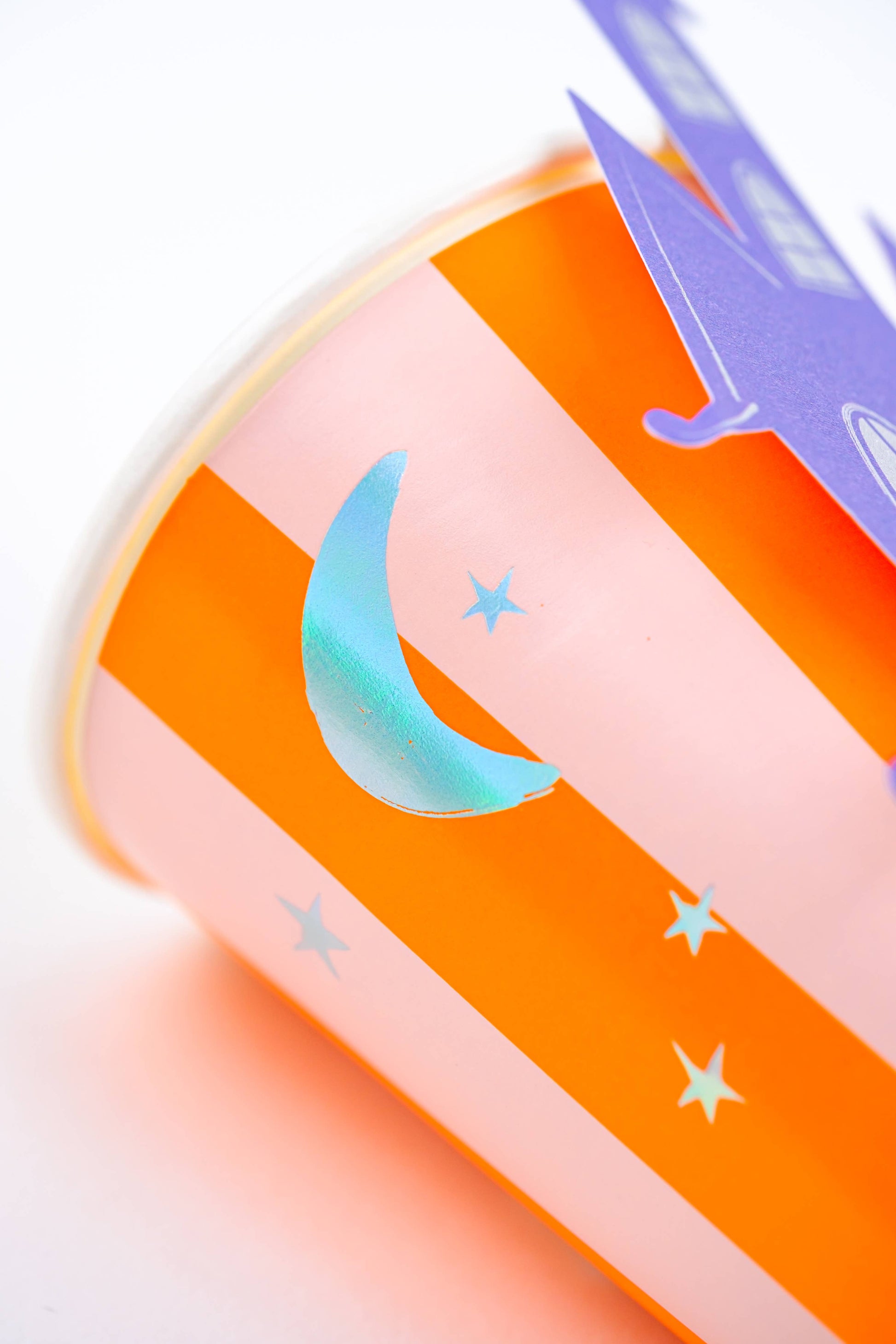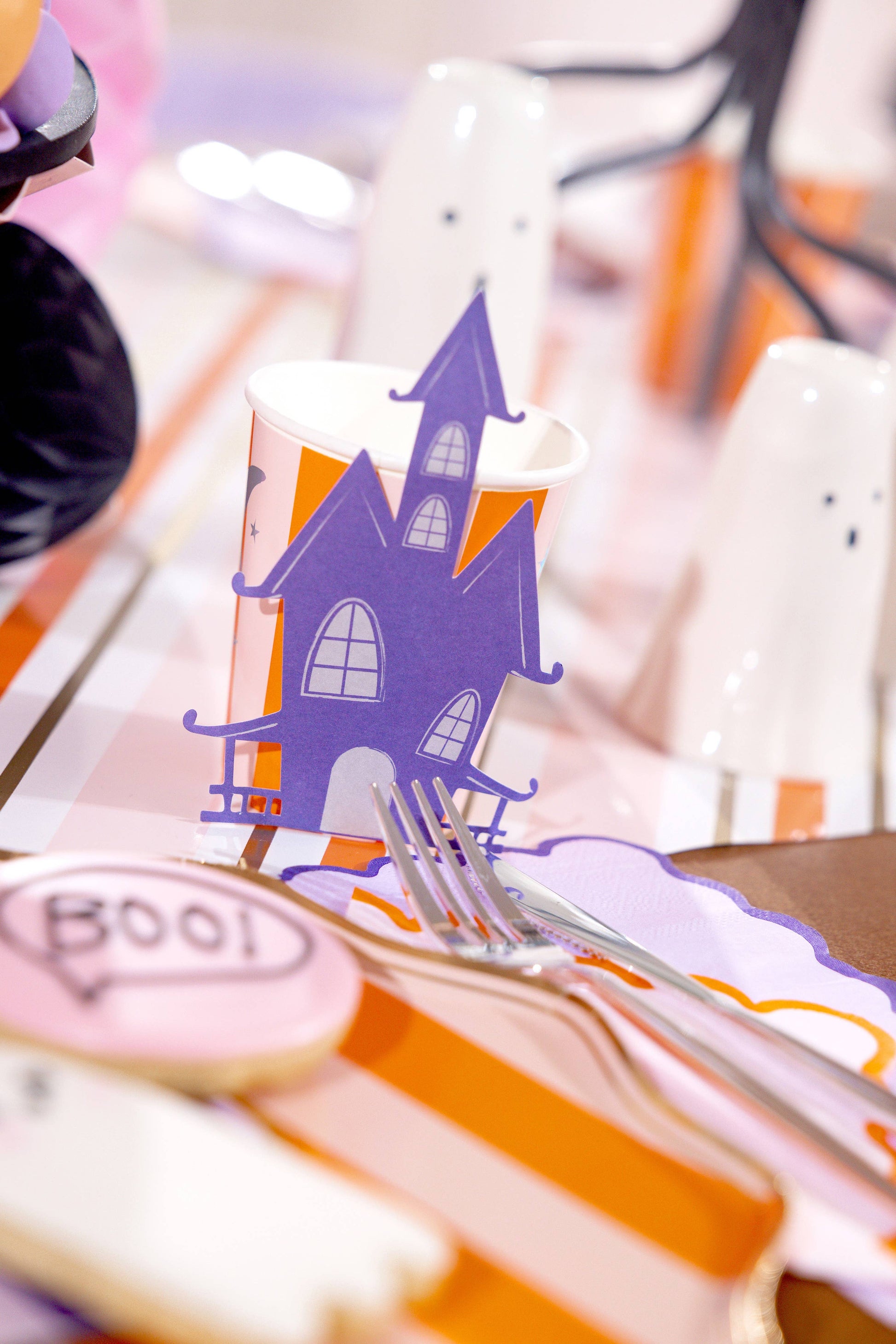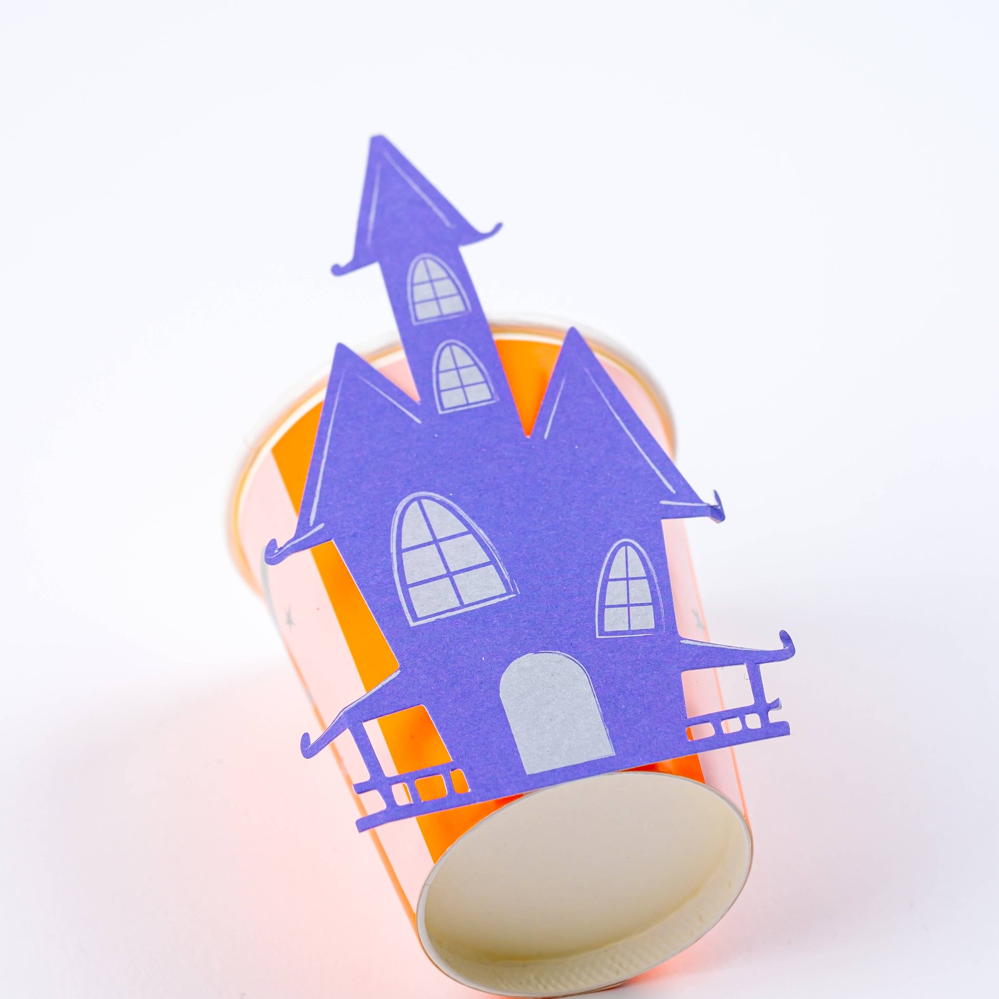 Get ready to spook up your drinkware with our Haunted House cups! Featuring a striped design, foil details, and a fun house applique, these cups add a touch of color and spookiness to any gathering. Perfect for Halloween parties or just adding some fun to your everyday drinkware. Don't miss out on these spooky and colorful cups!