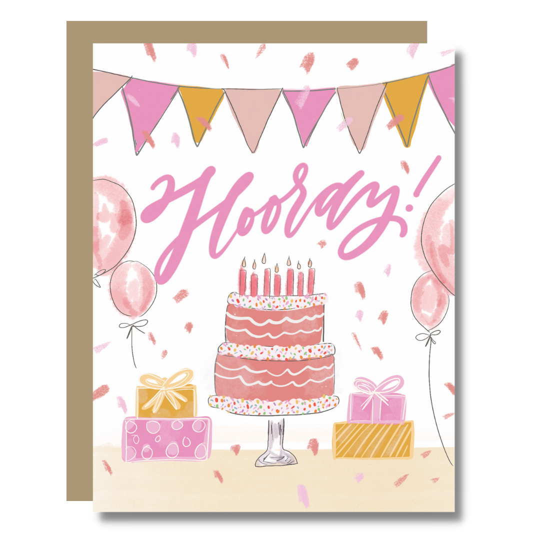 The table is set, the layer cake is decorated, and it's time to celebrate your favorite birthday person! Pop the confetti and shout HOORAY for another year of life for this person you love so dearly. A happy birthday greeting for someone truly special. A hand-illustrated birthday cake scene with "Hooray" message.