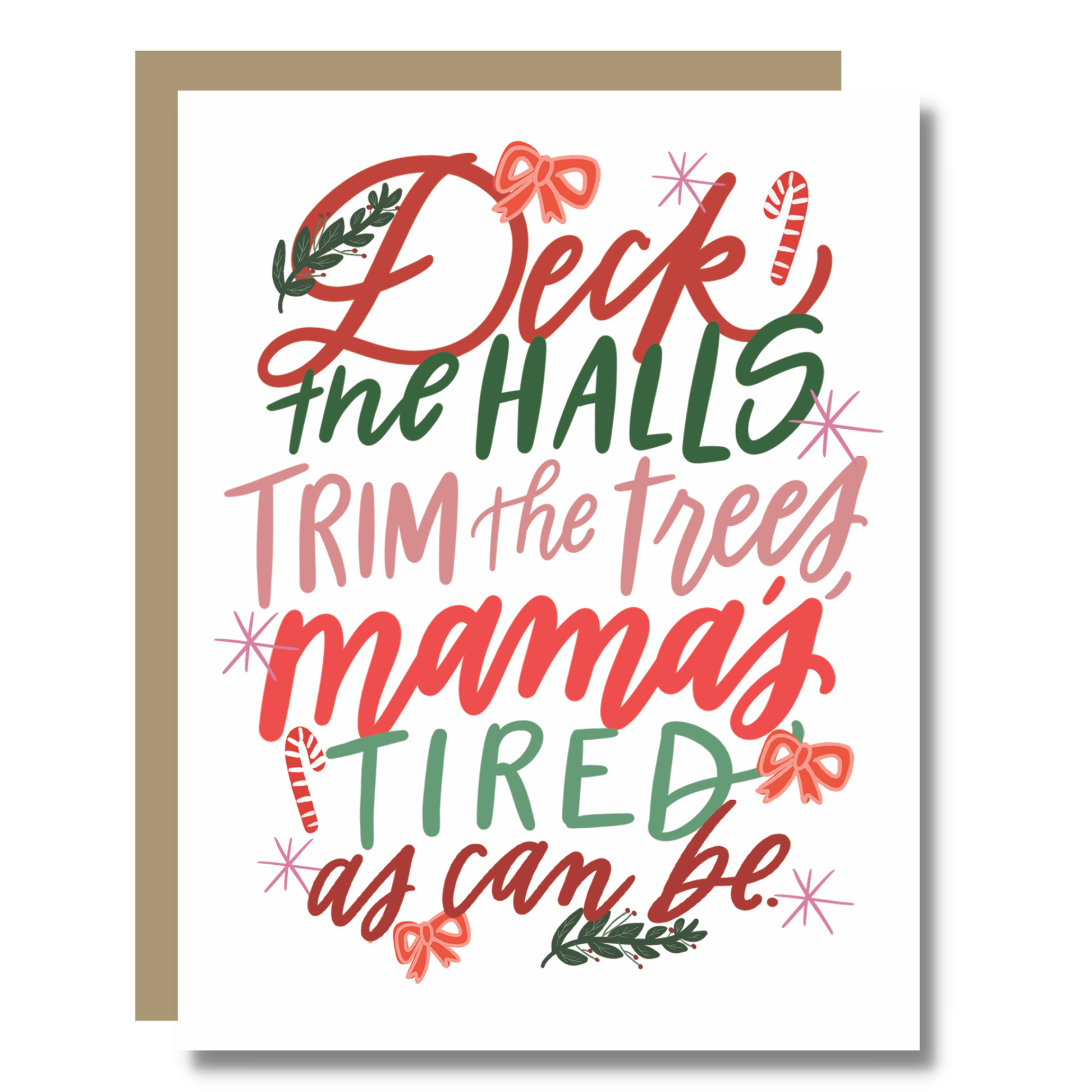 You know what's true about the Christmas season? It's magical. You know what's also true about the moms who make the magic happen? They're TIRED. Moms are absolutely exhausted at Christmas time; it's a well known fact. This silly card will generate laughs among the hardworking mamas hustling to make holiday memories for their families. Hand-lettered "Deck the halls, trim the trees, mama's tired as can be" with hand-illustrated icons on a white background.